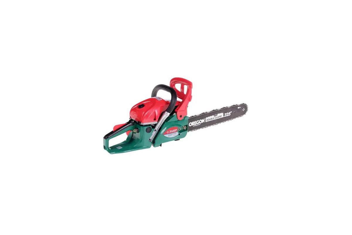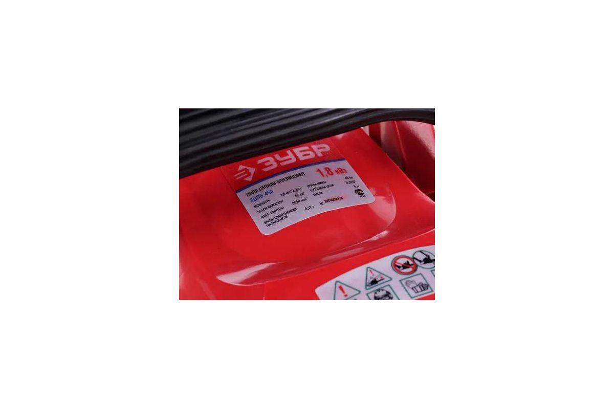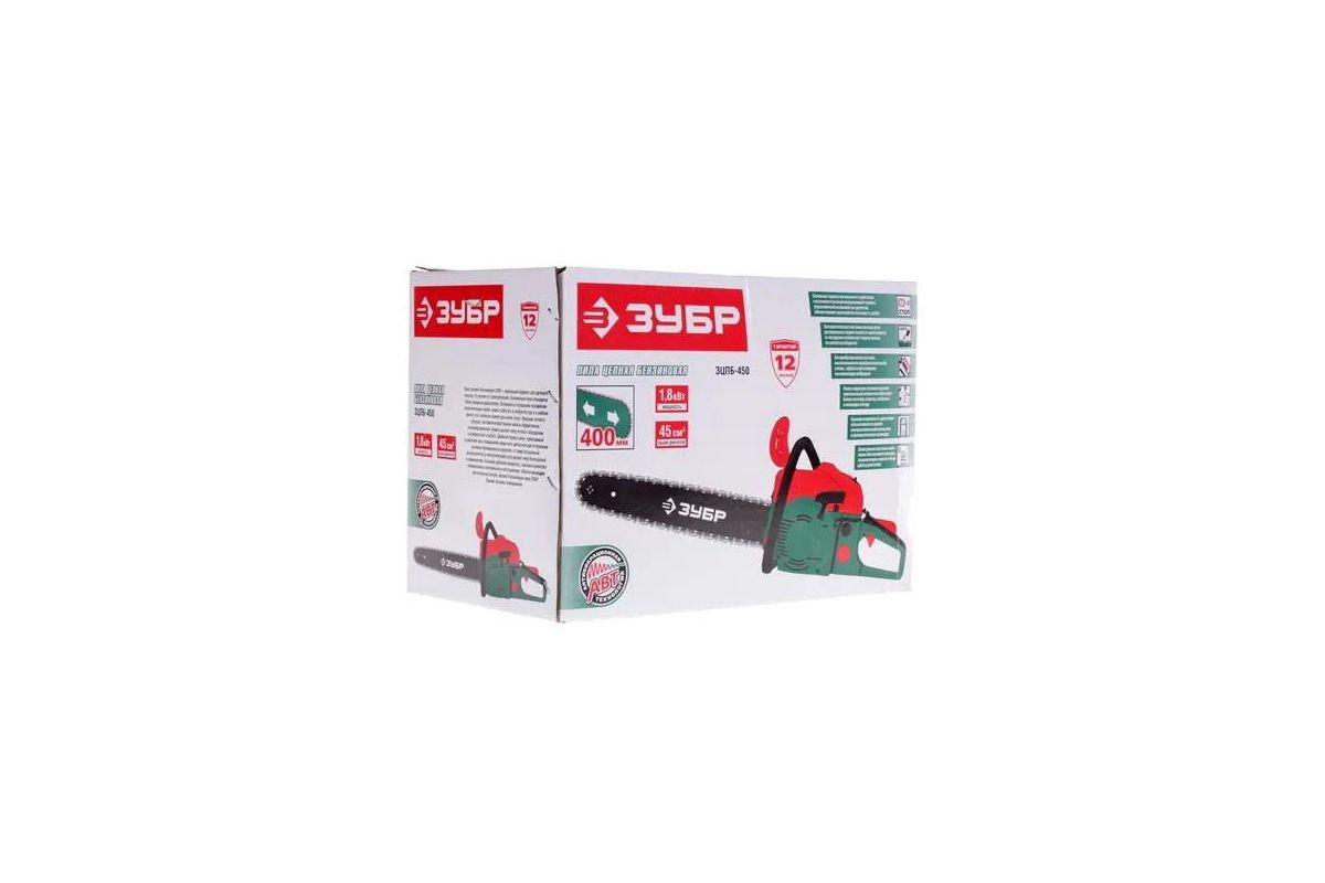 Бензопила ЗУБР ЗЦПБ-450 – цепная бензиновая пила с вертикально расположенным цилиндром объемом 45 см³. При мощности 1,8 кВт (2,4 л.с) двигатель развивает обороты от 3200 до 12500 об/мин. Емкости бензинового и масляного бака составляют 550/260 мл соответственно. Бензопила комплектуется шиной 400 мм с пильной цепью OREGON 34SL. Рекомендуется избегать работы при температурах ниже -10°С и выше +40°С. Вес не заправленной бензопилы 5,4 кг. Масса в упаковке 8 кг.