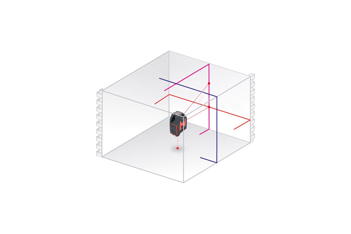 Построение горизонтальной плоскости и двух пересекающихся вертикальных, функция лазерного отвеса, функция лазерного маркера (удобна для разметки при разрезании материалов).