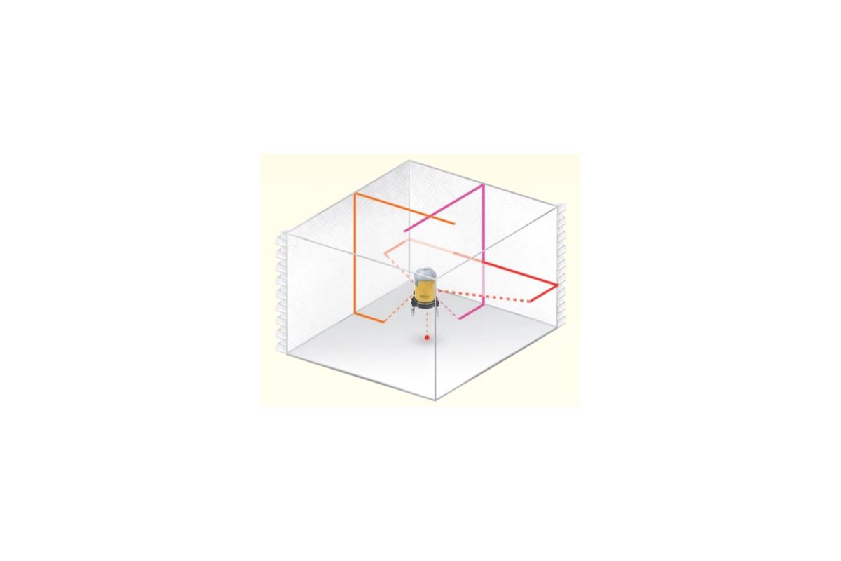 Нивелир оснащён 4 режимами работы. Проецирует 1 горизонтальную и 2 вертикальные линии, а также лазерный отвес.