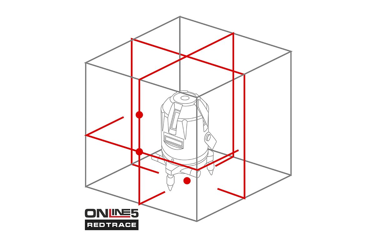REDTRACE ONLINE5 - это многофункциональный лазерный нивелир категории ПРОФИ. Прибор имеет полную вертикальную 3D развертку - 4 вертикальные и 1 горизонтальную плоскости, а также точки зенита и отвеса.