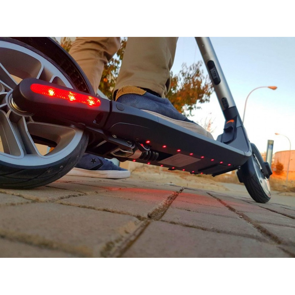 По бокам у Найнбот ES2 расположены световозвращатели. В передней части и на заднем крыле это наклейки-катафоты. А сзади красуются полноценные габаритные огни. В каждом установлено по 3 ярких светодиода, их хорошо заметно даже днём. При торможении они выполняют роль стоп-сигнала: мигают, привлекая внимание. Габаритные огни можно включать и отключать с помощью приложения.