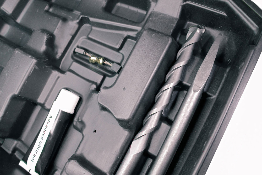 • В комплекте дополнительная рукоятка, кейс, угольные щетки, смазка, пика (зубило), бур (22х320 мм)