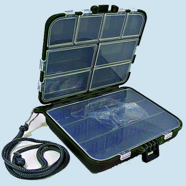 Двухстворчатая коробочка для крючков с отделениями в каждой ее части. Каждое отделение створки имеет защитную прозрачную крышку. Коробочка имеет ремешок для переноски.