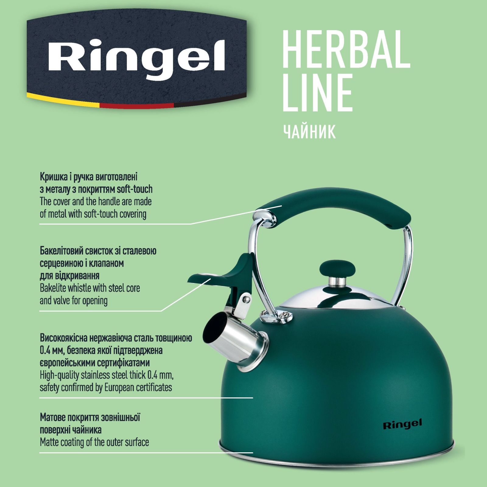 Нержавіюча сталь, що забезпечує міцність і довговічність конструкції: Чайники зі свистком від Ringel виготовлені з нержавіючої сталі з високим вмістом хрому, завдяки чому виріб отримує гарантований захист від корозії та деформації, а також не боїться нагріву до високих температур. Разом з тим, нержавіюча сталь, з якої виготовлений чайник є повністю безпечною для здоров'я.