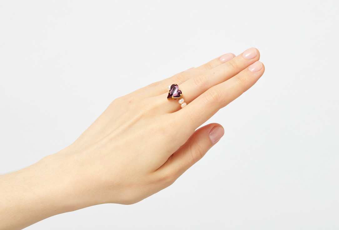 Кольцо с оправой из латуни, покрытой золотом 24к. Кольцо украшено речным жемчугом и крупным кристаллом в виде сердца приглушенного розового цвета. Основой кольца является металлический ювелирный тросик. За счет мягкости, кольцо подходит сразу на два размера.