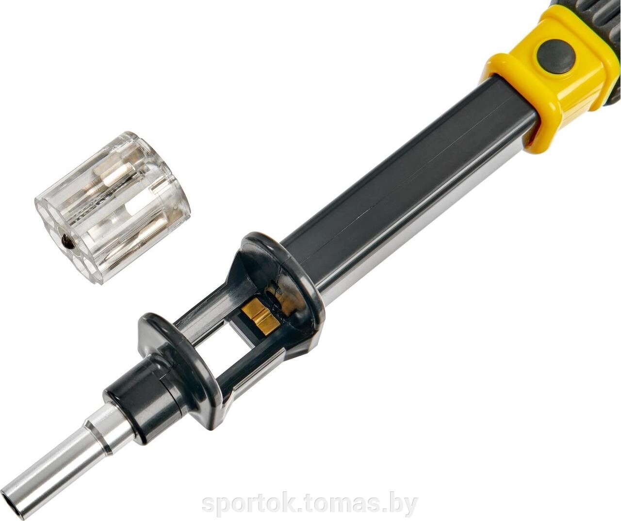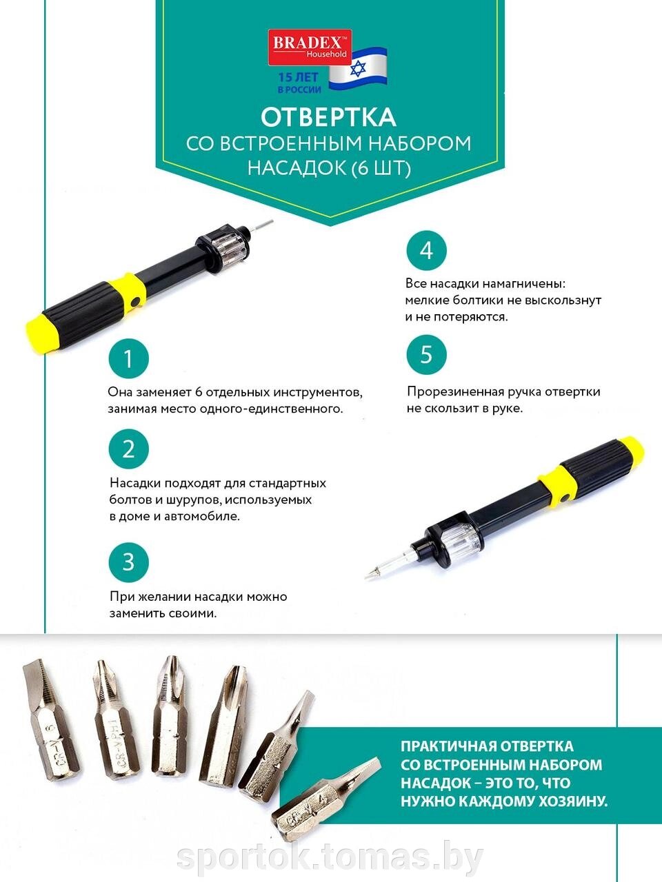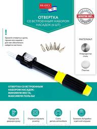 СпецификацийМатериал: углеродистая сталь, АБС - платик Комплектация: отвертка, набор из 6 насадок, инструкция Рекомендации по уходу: храните инструмент в сухом месте. После работы очищайте инструмент от грязи.