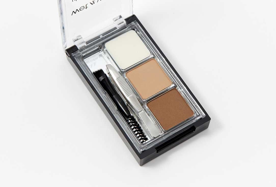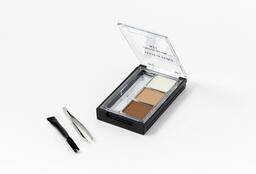 Набор из 5 предметов включает в себя пинцет, кисть для бровей с щеточкой, 2 оттенка теней для бровей и воск для моделирования бровей.