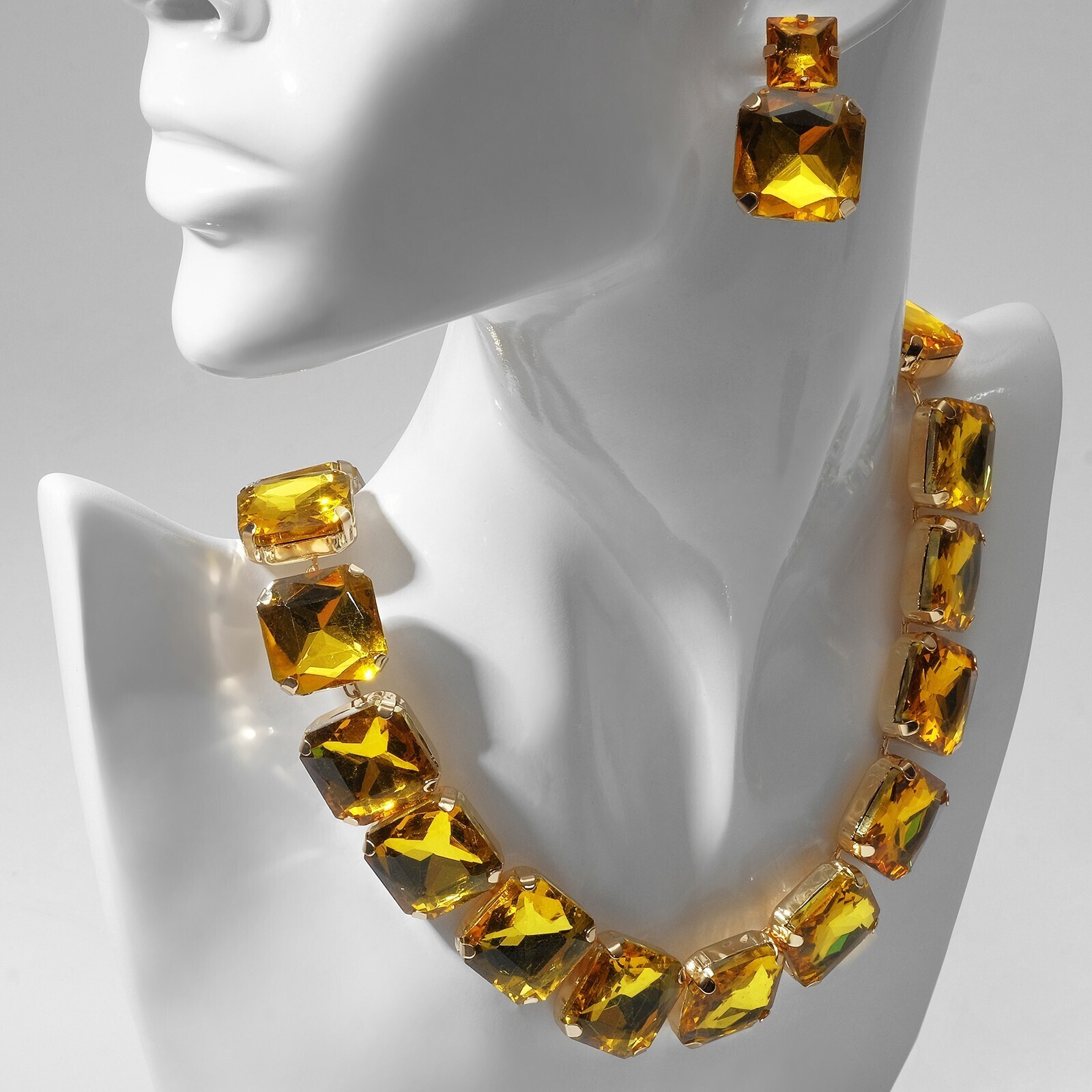 Набор 2 предмета: серьги, колье "Драгоценность" квадраты, цвет жёлтый в золоте, 32см