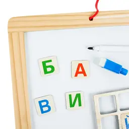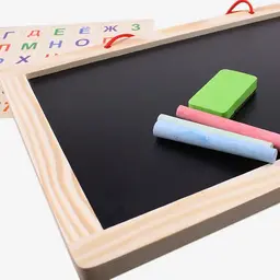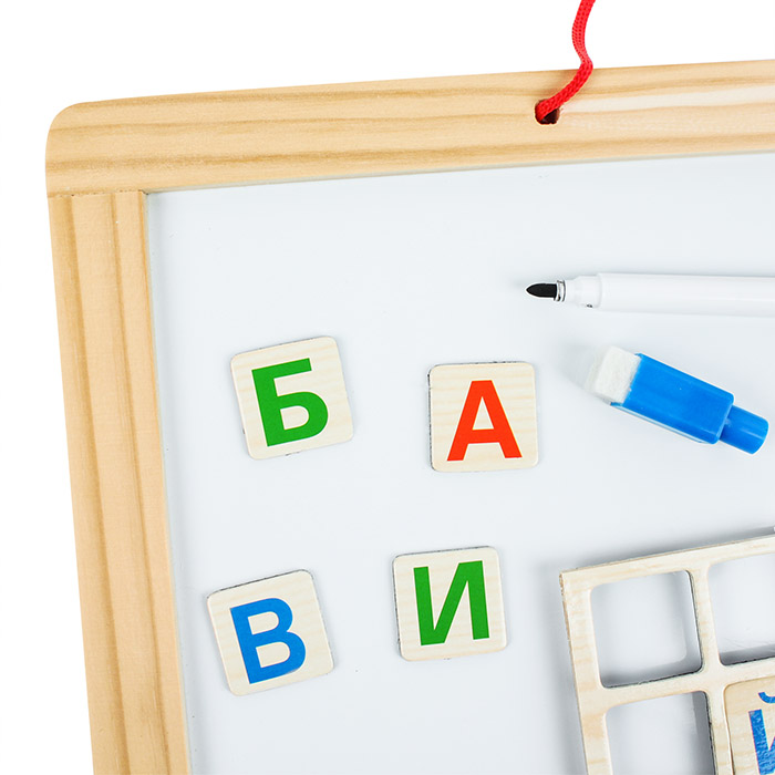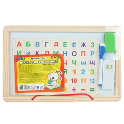 Доска для рисования двусторонняя .Размер доски:20*31см.Комплектность :доска , мелки , губка ,магниты (буквы , цифры , знаки), маркер. Доска покрыта защитной плёнкой перед использованием удалить. Лаковое покрытие используется для письма специальными маркерами для белой доски , тёмное-для письма мелом. Надписи стираются сухой губкой , предназначенной для магнитно-маркерных досок. Упаковка-плёнка.