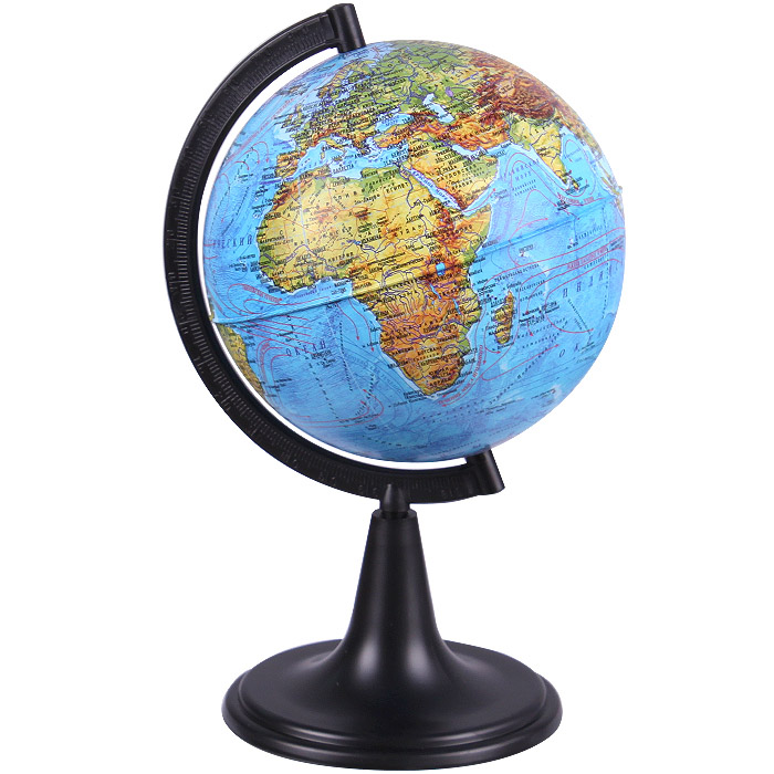 Физическая карта глобуса отображает все значимые географические объекты: материки, океаны и моря с указанием течений, горные хребты, плоскогорья и равнины, реки, озера. Диаметр: 12 см. Упаковка: картонная коробка (20*12*12 см).