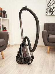 Особенности пылесосалегко очищаемый пылесборник, поворачивающиеся колеса, шланг