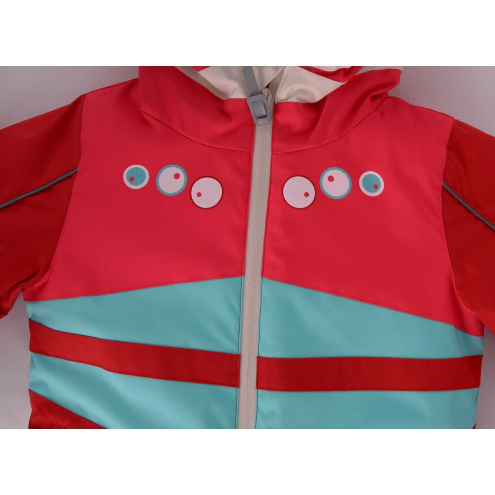 Съёмный капюшон на кнопках с боковыми резинками и манжеты рукавов на резинке.