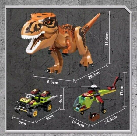 В комплекте 3 минифигурки + 3 фигуры Динозавров + вертолет + квадроцикл