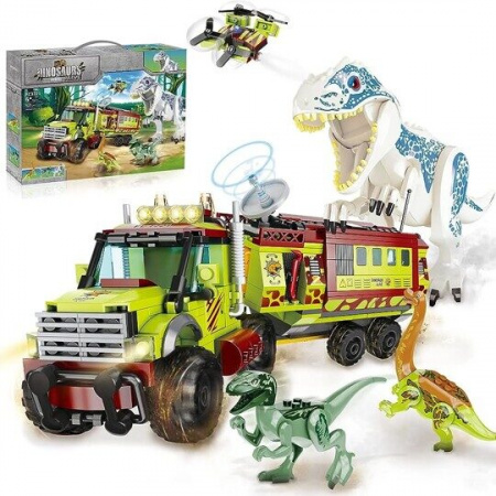 В комплекте 4 минифигурки + 3 фигуры Динозавров + дрон + грузовик-лаборатория + мотоцикл