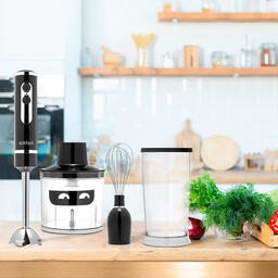 • В комплекте венчик, измельчитель, стакан, насадка-блендер