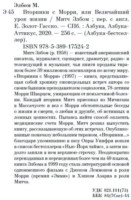 Книга Азбука Вторники с Морри, или Величайший урок жизни (Элбом М.)