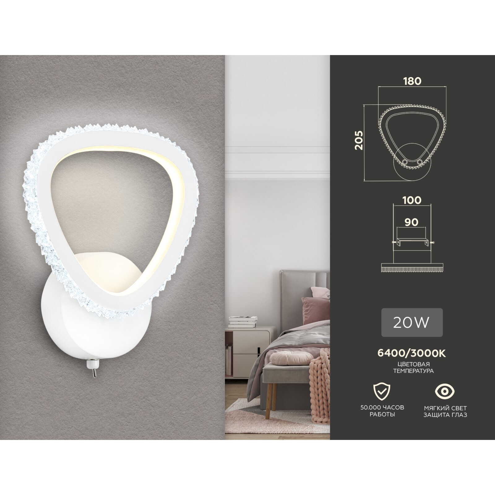 Настенный светодиодный светильник с выключателем на корпусе FA9557, 20Вт, 205х180х90 мм, цвет белый