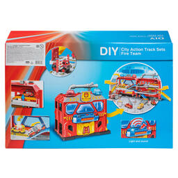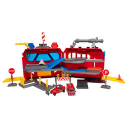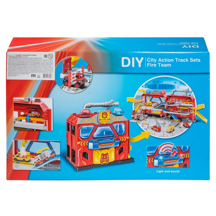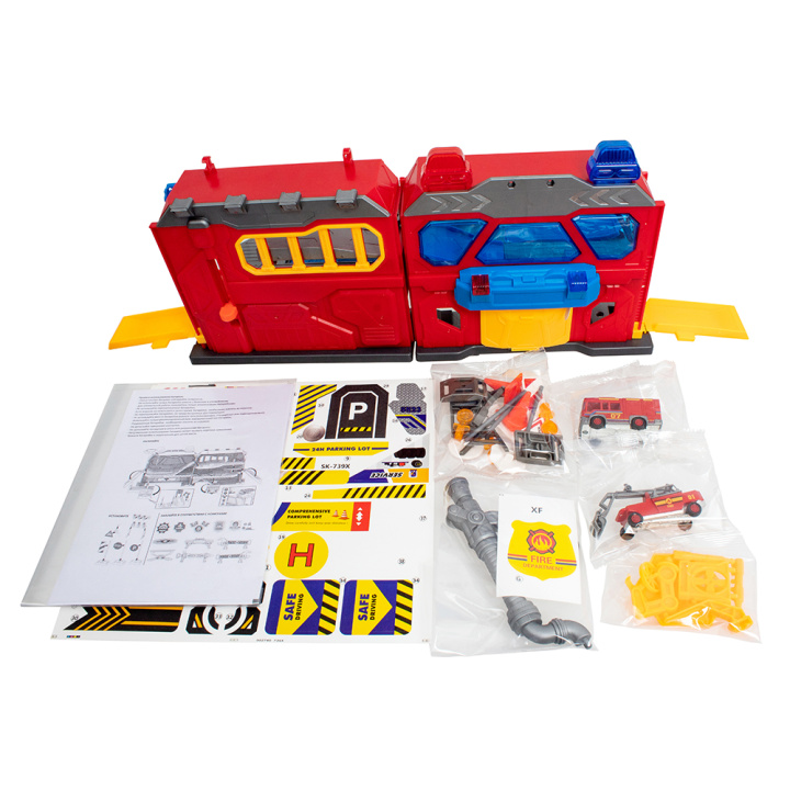 Игровой набор «паркинг-чемоданчик» оснащен светозвуковыми эффектами. Главная тематика набора – это пожарная служба. В закрытом состоянии набор представляет собой чемоданчик с ручкой, что обеспечивает удобство хранения и транспортировки. Чтобы открыть чемоданчик, нужно повернуть защелку по часовой стрелке. Чемоданчик распахивается надвое, трансформируясь в игровую среду. Откидываются рампы, меняется их положение, части паркинга выдвигаются, открывается дверца гаража, манипулятор и щетки автомойки вращаются, шланг подвижный. По нажатию на кнопку над дверцей гаража паркинг начинает издавать звук сирены, включаются две мигалки.