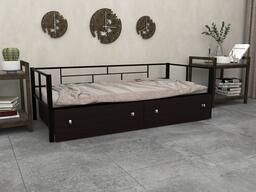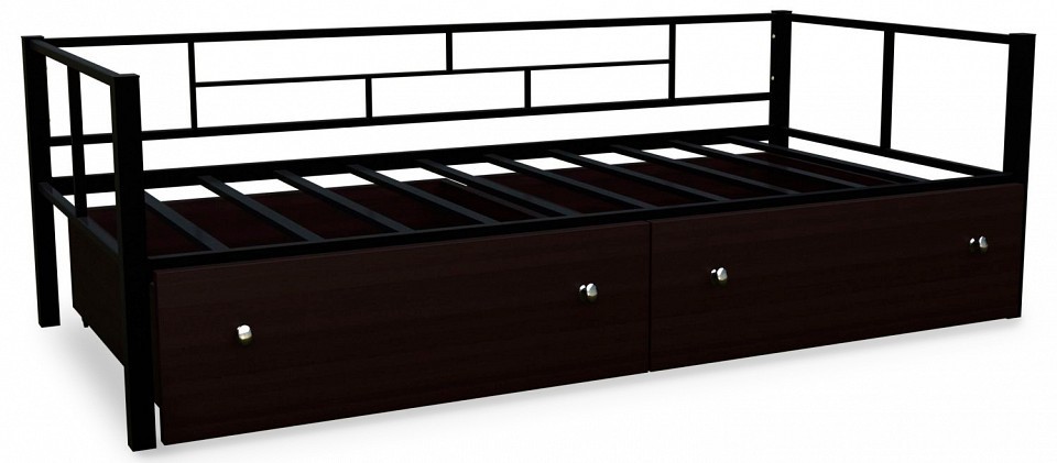 Длина спального места, мм: 1900, Ширина спального места, мм: 900, Материал фасада: ЛДСП Е1, Материал покрытия корпуса: краска порошковая, Материал корпуса: сталь, Тип поверхности корпуса: матовый, Художественное описание товара: Кровать Арга имеет надежную металлическую конструкцию. Толщина профиля 1,5 мм, покрашена безопасной, не имеющей запаха порошковой краской. Основание сварное из металлических ламелей, выдержит нагрузку до 150 кг. Комплектуется выкатными ящиками для белья. Ящики сделаны из ЛДСП и имеют пластиковые колеса., Цвет корпуса: черный, Цвет фасада: венге, Основной цвет мебели: древесина коричневая темная венге