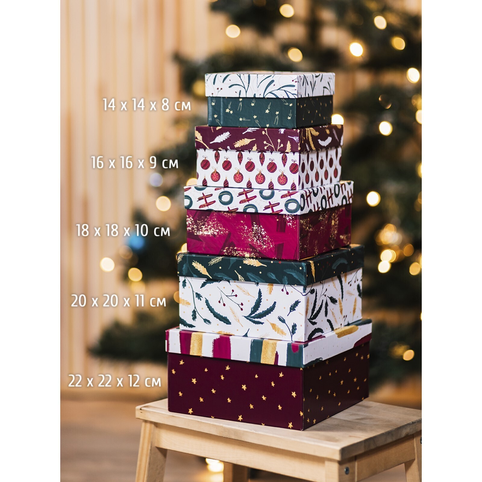Размер коробок: 14 х 14 х 8 см 16 х 16 х 9 см 18 х 18 х 10 см 20 х 20 х 11 см 22 х 22 х 12 см
