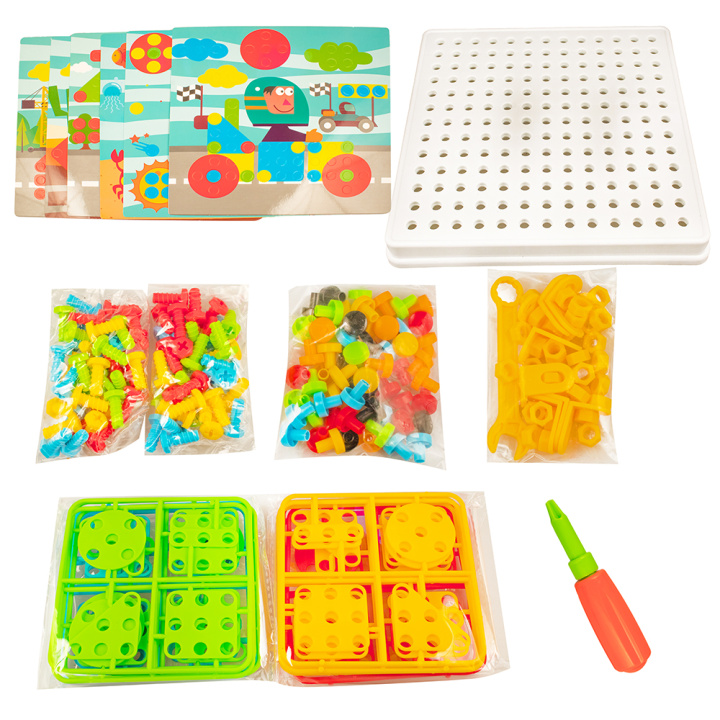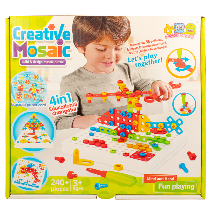 Оригинальный набор мозаики с элементами конструктора станет для ребенка очень полезным и увлекательным подарком к любому мероприятию. Данный набор особенно заинтересует усидчивых детишек, ведь теперь можно собрать безграничное количество картин, используя не только стандартные детали мозаики, но и шурупы, гайки и прочие приспособления, позволяющие создать изображение на игровом поле.