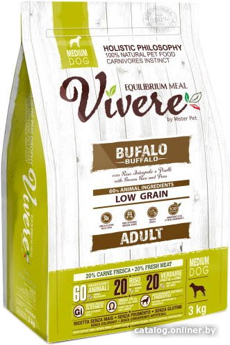 - Ингредиенты Обезвоженное мясо буйвола (26%), свежее мясо буйвола (20%), бурый рис (20%), гороховый крахмал, жир индейки и курицы (11%), горошек, кормовые бобы, семена льна (3%), гидролизованный белок печени (3%), дрожжи, сушеная мякоть свеклы, мука морских водорослей (0,3%), поваренная соль, дрожжевые продукты (MOS 0,2%), Юкка Шидигера (0,03%), сушеная кожура граната (0,02%), семена расторопши (0,02%), сушеное яблоко (0,02%), сушеные цветки гибискуса (0,016%), сушеные плоды шиповника (0,002%).