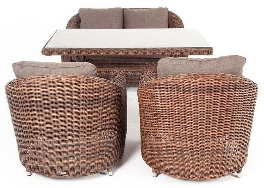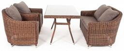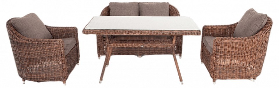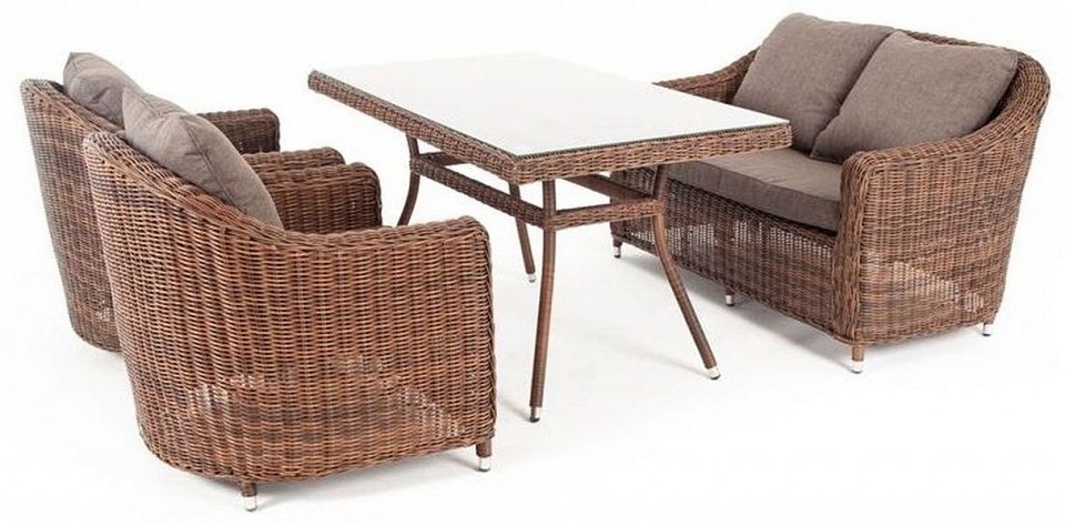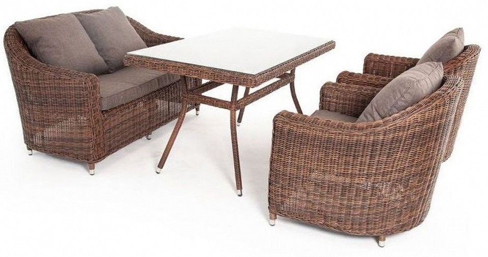 Цвет обивки: серый, Цвет столешницы: неокрашенный, Материал обивки: полиэстер, Материал столешницы: стекло закаленное, Материал корпуса: дюралюминий, ротанг искусственный, Тип поверхности корпуса: матовый, Тип поверхности столешницы: прозрачный, Форма столешницы: прямоугольная, Художественное описание товара: Набор уличный Кон Панна компактный комплект, рассчитанный на 4 персоны. В его состав входят два плетеных кресла, двухместный диван и обеденный стол., Дополнительные параметры: полиэстер - 230 гр/м2, Цвет корпуса: коричневый, Основной цвет мебели: коричневый